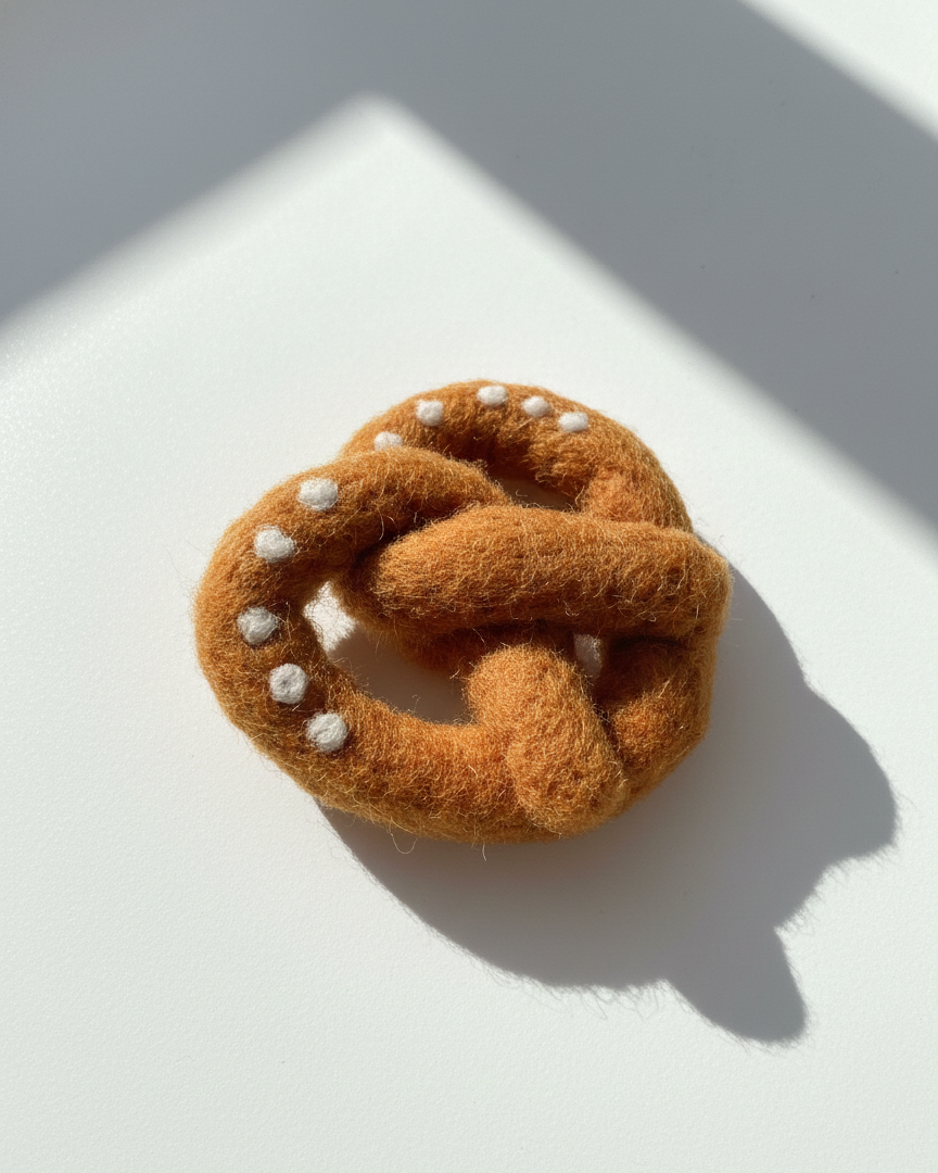A handmade wool magnet inspired by a classic soft pretzel, needle-felted with a soft texture and warm baked tones. Defined by its twisted form and subtle salt details, each piece is individually made and subtly unique.